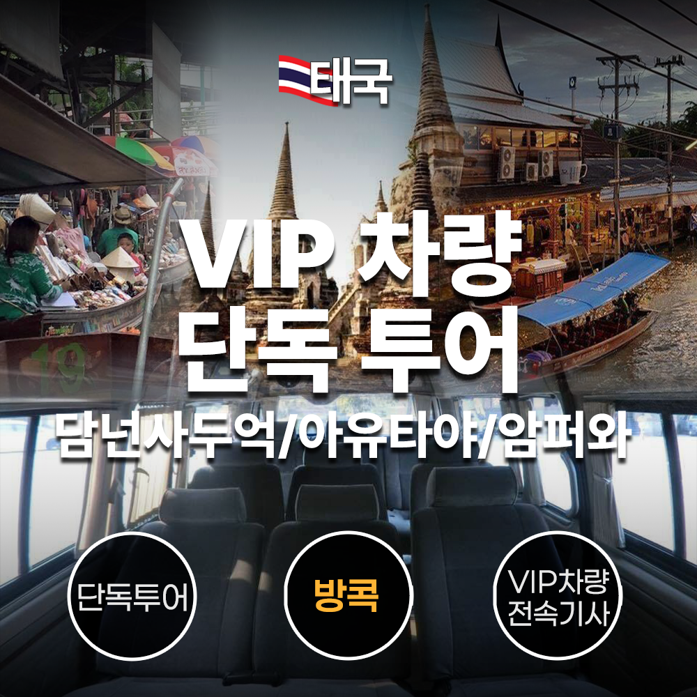 쾌적한 VIP 전용 차량으로 베테랑 기사님이 정해진 코스로 안내하는 투어 상품으로 담넌사두억/아유타야 오전 투어/아유타야 오후 투어/암퍼와 주말 시장 등 방콕 외곽의 인기 있는 관광 명소를 호텔 픽업 후 편리하고 편안하게 관광 후 호텔 드랍 OR 시내 드랍이 가능한 상품입니다.